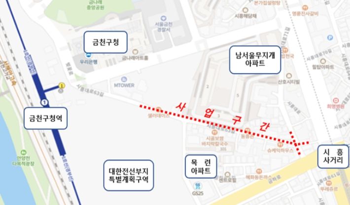 사업 범위는 금천구청 인근 ‘시흥대로63길’과 ‘시흥대로71길’ 일부 약 350m 구간이며, 31개 건물의 약 107개 업소를 대상으로 한다.