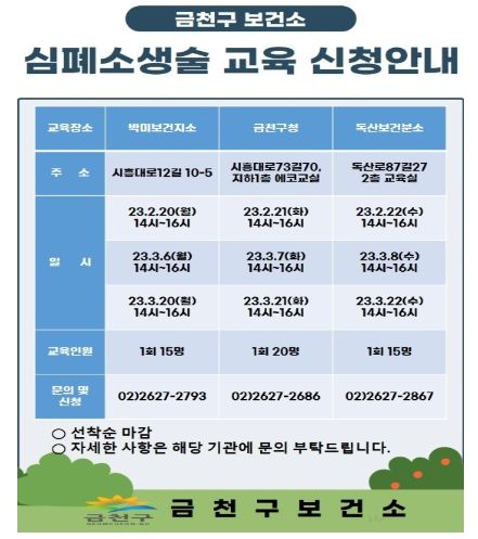 교육대상은 만 10세 이상 금천 구민 또는 일반인이며, 금천 구민을 우선으로 한다. 교육은 △ 심폐소생술 이론 △ 마네킹을 이용한 실습 시범 △ 심장충격기 사용법 등 이론과 실습으로, 1회 2시간 과정으로 이루어진다. 교육을 마친 자에게는 수료증을 교부한다.
