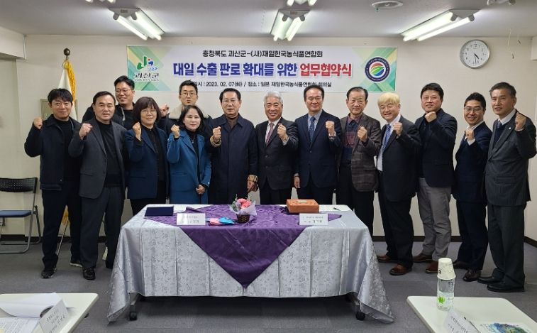 지난 7일 도쿄 재일한국농식품연합회 회의실에서 송인헌 괴산군수, 김규환 회장을 비롯해 관계자 17명이 참석한 가운데 괴산군과 재일한국농식품연합회 간의 농식품 수출 확대를 위한 업무협약을 체결했다.
