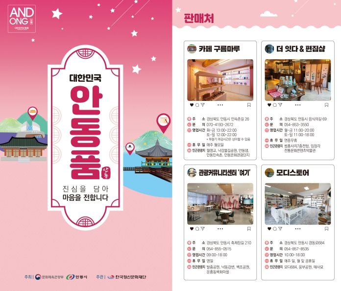 여행기념품 공모전 수상작이 판매되는 4개의 샵인샵은 월영교 내 카페 ▶‘구름마루’와 원도심에 자리한 카페 ▶‘잇다’, 탈춤공원에 있는 ▶ 관광커뮤니티센터 ‘여기’, 구)안동역에 위치한 ▶‘모디스토어’이다. 향후 OTA(온라인 트래블 에이전시)를 통한 온라인 판매도 추진할 예정이다.