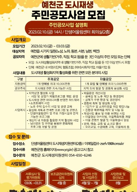 분야별로 살펴보면 지역상권 활성화‧예천읍 도시재생 활성화 계획과 연계한 프로그램 및 콘텐츠 개발 등 도시재생 관련 주제공모와 마을환경 개선‧공동체 회복 및 활성화 등 지역 의제 발굴, 공동체 활성화를 위한 자율공모가 있으며 주제공모는 최대 1,000만 원, 자율공모는 최대 500만 원을 지원할 계획이다.
