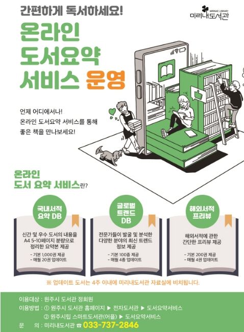 '온라인 도서요약 서비스'는 원주시 도서관 홈페이지와 도서관 어플(원주시립 스마트도서관)을 통해 국내 서적 요약, 글로벌 트렌드 정보 등을 제공하는 서비스로 인문, 경제, 교양서 등 연간 1,000여 권의 도서에 대한 핵심 정보를 제공한다.