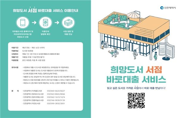 [제주교통복지신문 김강석 기자] 인천광역시는 미추홀도서관 및 분관(청라호수‧청라국제‧영종하늘‧마전도서관)에서 원하는 책을 무료로 바로 빌려볼 수 있는 ‘희망도서 서점 바로대출’서비스를 옹진군을 제외한 9개 군‧구에 위치한 41개 동네서점에서 운영 중이라고 밝혔다.