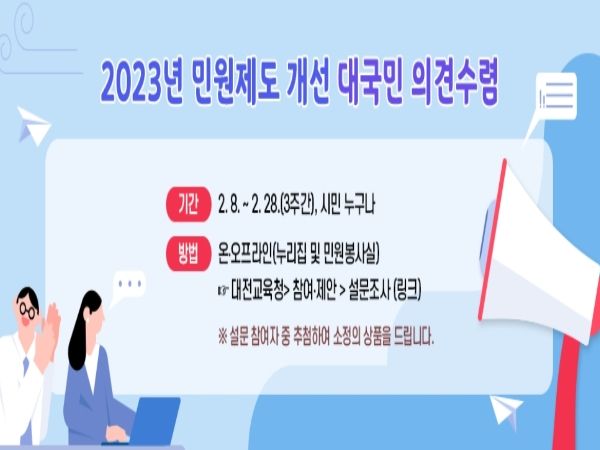 설문에 참여하신 분 중 추첨을 통해 소정의 선물을 지급할 예정이며, 일상생활에서 접하는 민원신청 처리 시 불편사항, 사회배려대상자를 위한 개선 의견, 특정 사안 등에 대한 민원 신청은 대전광역시교육청 누리집 대전교육신문고를 이용하여 접수가 가능하다.