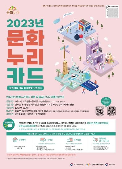 신규 및 재발급 대상자는 올해 11월 30일까지 발급 신청이 가능하며, 해당 읍․면 행정복지센터 방문, 문화누리카드 홈페이지, 문화누리 모바일 앱, ARS 등에서 신청할 수 있다.