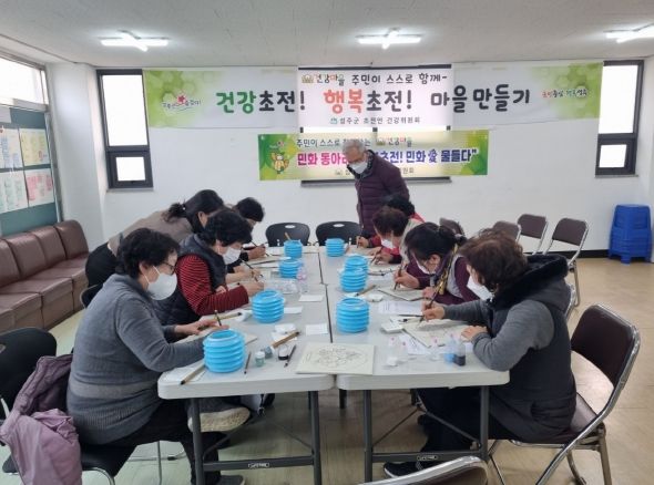 [제주교통복지신문 김강석 기자] 성주군은 주민이 스스로 만들어가는 건강마을 조성사업의 일환으로 초전면 건강위원, 건강지킴이, 마을주민이 함께 2. 7 부터 4. 25 까지 12주간 매주 화요일 초전면 건강위원회 사무실에서 민화 동아리 '행복초전! 민화愛 물들다' 를 운영한다.
