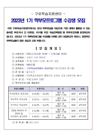 [제주교통복지신문 김강석 기자] 구로구가 구로학습지원센터 학부모프로그램을 3년 만에 대면 수업으로 전환해 수강생을 모집한다.