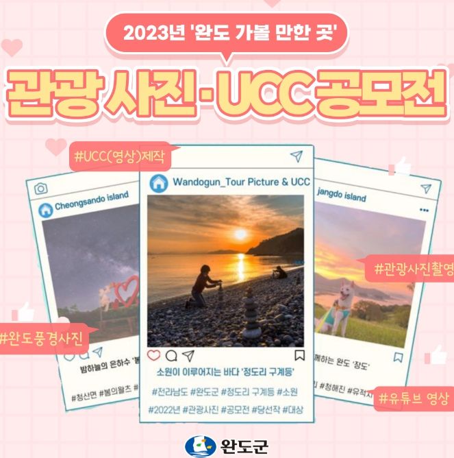 군 관계자는 “이번 공모전을 통해 2023 관광 트렌드에 맞는 새로운 여행지를 발굴하고 알릴 수 있는 사진과 UCC를 선정하여 완도군 관광 홍보 마케팅에 적극 활용하는 등 관광객 유치에 최선을 다하겠다”라고 말했다.
