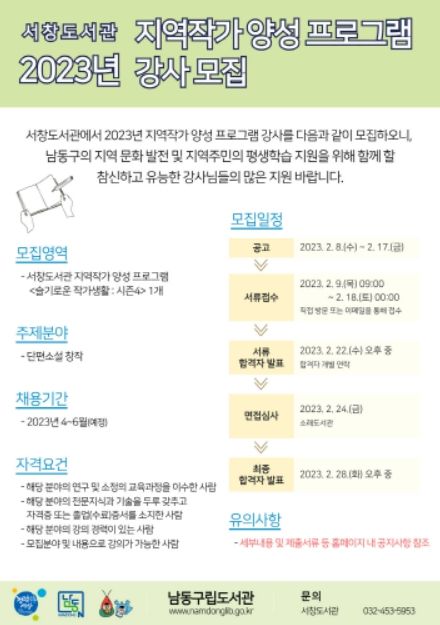 [제주교통복지신문 김강석 기자] 인천시 남동구립도서관은 올해 4~6월 서창도서관에서 진행되는 ‘2023년 지역작가 양성 프로그램’을 진행할 강사를 공개 모집한다고 8일 밝혔다.