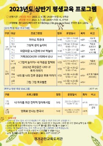 유아·학생 대상 프로그램으로는 ▲그림책 생각 놀이터, ▲'그림책 놀이터' 내 마음을 말해봐, ▲히어로 특공대, ▲와글와글 도서관에 ON! 책놀이, ▲2023년 주인공은 나야 나! 토끼 이야기, ▲그림 그림 토요웹툰, ▲거북(BOOK)아! 무대에서 만나, ▲나의 꿈 나의 진로 궁금한 로봇 이야기 등 8개 강좌이며 강좌별 4회 운영한다.