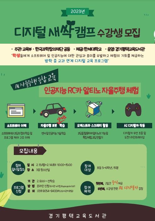 [제주교통복지신문 김강석 기자] 경기평택교육도서관(관장 홍은경)은 13일과 14일 이틀간 관내 초등학생 5~6학년 15명을 대상으로‘2023년 디지털 새싹 캠프’를 운영한다.