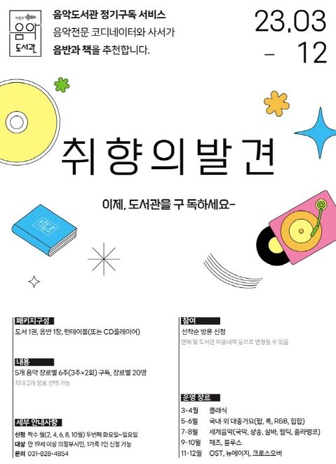 2023년을 맞아 의정부음악도서관에서 새롭게 선보이는 ‘취향의 발견’은 책이나 음반을 고를 때, 본인만의 취향이나 선택기준이 없어 어려움을 겪는 시민들을 위해 사서와 음악전문 코디네이터가 선정한 자료를 장르별 패키지로 추천받는 정기구독 서비스이다.