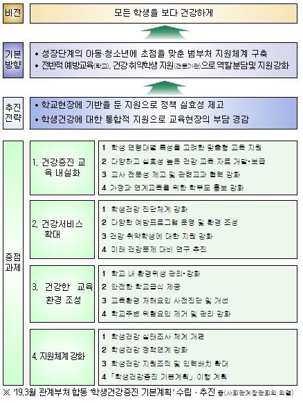 '학교보건법'개정(2021.9.24.)에 따라, 교육부장관은 5년마다 ‘학생건강증진 기본계획’을 수립·시행해야 하며, 교육감과 협의하여 학생건강증진 전문기관을 설립하거나 지정할 수 있다.