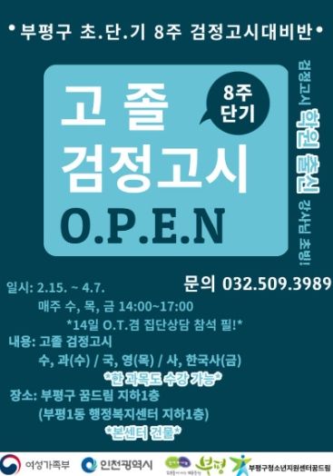 [제주교통복지신문 김강석 기자] 부평구 학교밖청소년지원센터가 오는 15일부터 4월 7일까지 제1회 고졸 검정고시 대비반을 운영한다.