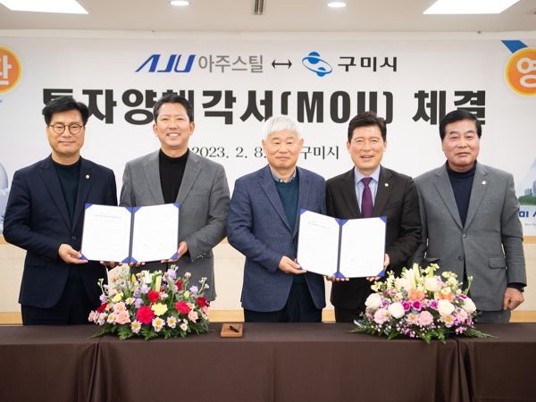 [제주교통복지신문 김강석 기자] 구미시는 2월 8일 10:00 시청 상황실에서 아주스틸(주) 이학연 대표이사, 지역 국회의원, 시의회 의장, 시의원, 기관단체장들이 참석한 가운데 구미시와 아주스틸(주) 간 투자양해각서(MOU) 체결식을 개최했다.