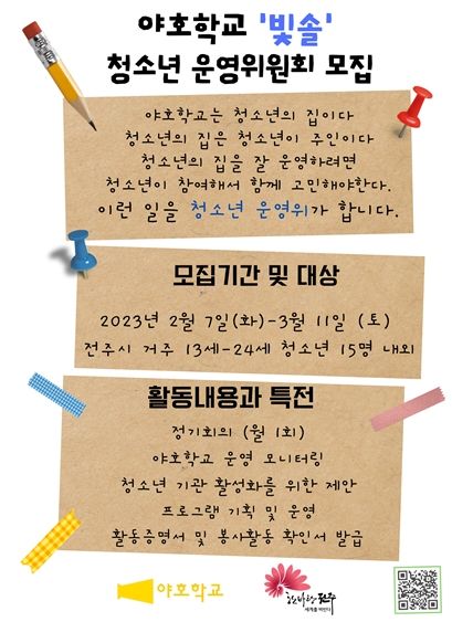 전주시 야호학교는 다음 달 11일까지 전주지역 13~24세 청소년을 대상으로 야호학교 청소년운영위원회 운영위원 15명 정도를 모집한다.