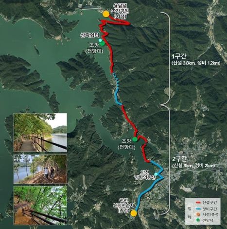 구체적으로는 △1단계(2024년) 용담댐 조각공원-구실재 방향 안내시설 및 전망대, 쉼터 조성과 △2단계(2025년) 구실재~안천면 신지천 습지까지 이르는 곳의 탐방로 신설 및 정비 및 안내시설 및 전망대 쉼터 등을 조성한다.