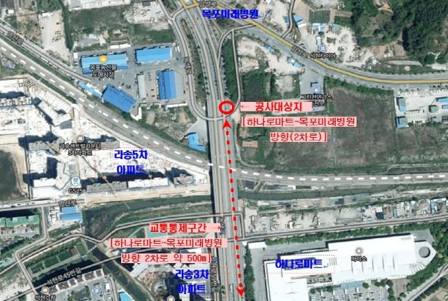 시는 교통 흐름에 방해되지 않도록 출근시간대를 피해 오는 9일 오전 9시 30분부터 보수공사를 실시해 오후 5시까지 공사를 진행할 예정으로, 일부 차선(하나로마트→목포미래병원, 2차로)이 통제된다.