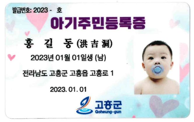 [제주교통복지신문 김강석 기자] 고흥군은 올해부터 출산가정에 소중한 아기 탄생을 기념할 수 있는 ‘아기 주민등록증’ 발급 서비스를 실시한다.