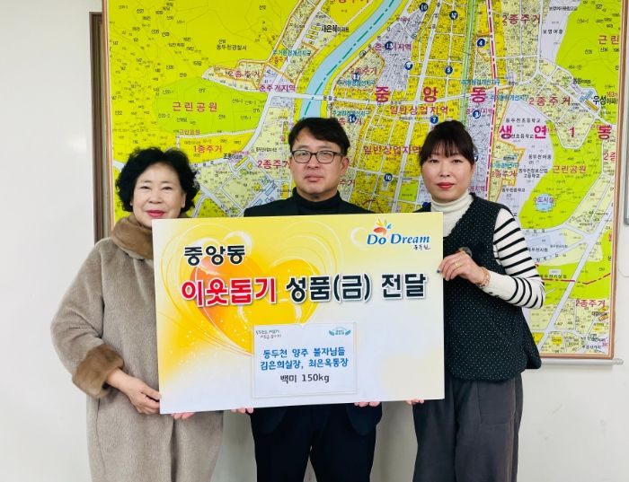 [제주교통복지신문 김강석 기자] 동두천시 중앙동 행정복지센터는 지난 2일 최은옥 통장과 인근 사찰의 김은희 실장이 방문해 관내 어려운 이웃을 돕는 데 써달라며 백미 150㎏을 전달했다고 전했다.