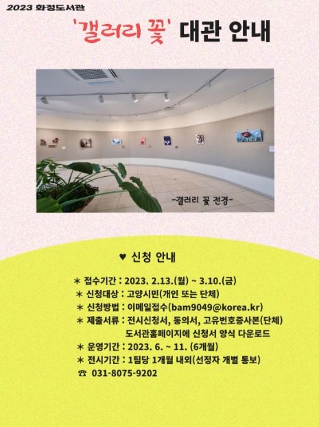 [제주교통복지신문 김강석 기자] 고양특례시 꽃 특성화 도서관 화정도서관이 일반 시민을 위한 전시 공간 ‘갤러리 꽃’ 대관을 시작한다.