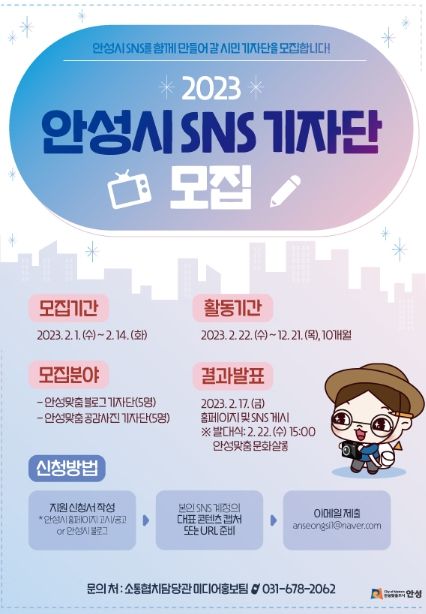 [제주교통복지신문 김강석 기자] 안성시는 시 SNS에 활기를 불어 넣을 시민기자단 ‘안성시SNS기자단’을 오는 14일까지 모집한다고 밝혔다.