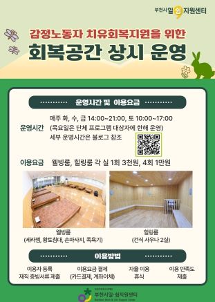 [제주교통복지신문 김강석 기자] 부천시 일·쉼지원센터에서 2023년 감정노동자 치유회복을 위한 회복공간(웰빙룸·힐링룸)을 상시 운영하고 있다.
