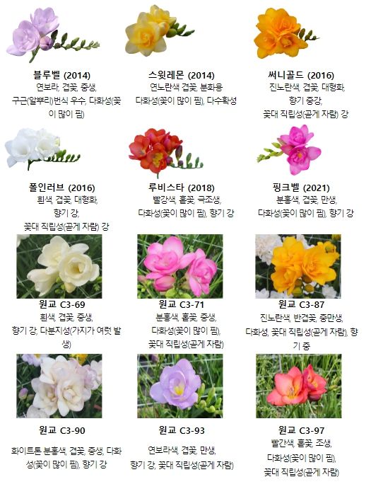 새로운 계통 중 분홍색 중생종 ‘원교 C3-71’과 연보라색 만생종 ‘원교 C3-93’은 바이러스와 구근부패병 발생이 적고, 꽃대가 곧게 자라며 향기가 진하다.