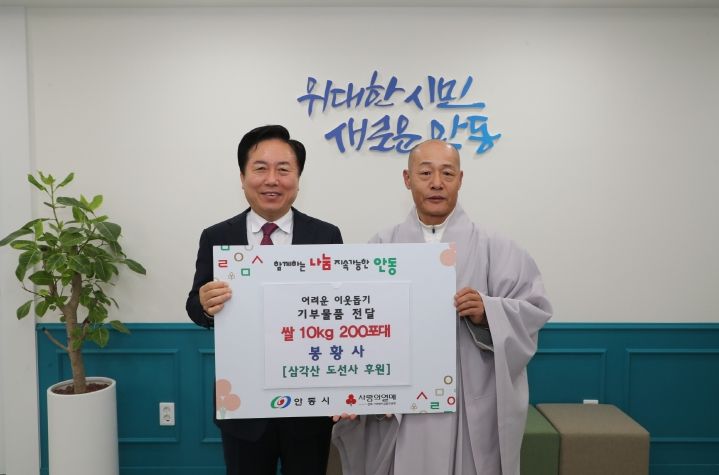 권기창 안동시장은 “부처님의 자비를 나누며 더불어 살아가는 공생의 가치를 실천해준 봉황사와 세심사에 감사드리고, 기부 물품이 어려운 이웃들에게 뜻깊게 사용될 수 있도록 최선을 다하겠다.”라고 말했다.
