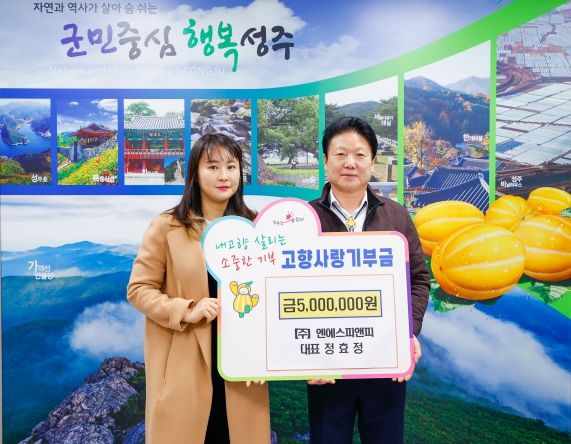 [제주교통복지신문 김강석 기자] 성주군은 2월 8일, ㈜엔에스피앤피 대표 정효정씨는 성주군에 고향사랑기부금 최고액인 500만원을 기부했다.