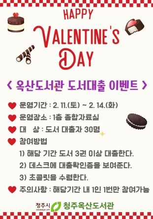 [제주교통복지신문 김강석 기자] 청주옥산도서관은 발렌타인데이를 맞아, 도서 대출 이용자를 대상으로 소소한 이벤트를 운영한다고 8일 밝혔다..