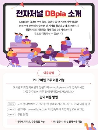 아울러 도서관 방문 시, DBpia개인회원 인증을 하면 도서관 외부에서도 90일간 서비스 이용이 가능하다.