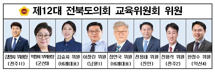 [제주교통복지신문 김강석 기자] 전라북도의회 교육위원회(위원장 김명지)는 7일 제397회 임시회 제2차 회의에서 감사관, 행정국, 7개 원에 대한 2023년 상반기 업무보고를 청취하는 시간을 가졌다.