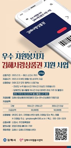 [제주교통복지신문 김강석 기자] 김해시는 자원봉사 동기 부여를 위해 우수 자원봉사자에게 김해사랑상품권을 지원한다고 8일 밝혔다.