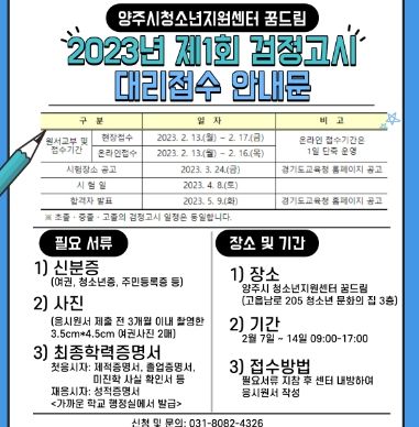 [제주교통복지신문 김강석 기자] 양주시청소년지원센터 꿈드림은 학교 밖 청소년들을 위해 2023년 제1회 초·중·고 졸업 학력 검정고시 응시 접수 대행을 지원한다고 밝혔다.