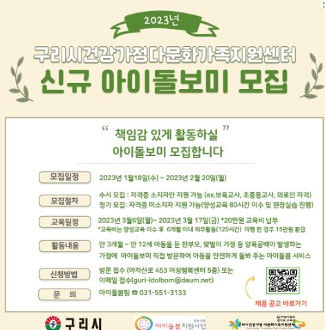 [제주교통복지신문 김강석 기자] 구리시는 구리시건강가정·다문화가족지원센터에서 오는 2월 20일까지 ‘2023년 상반기 신규 아이돌보미’를 모집한다고 밝혔다.