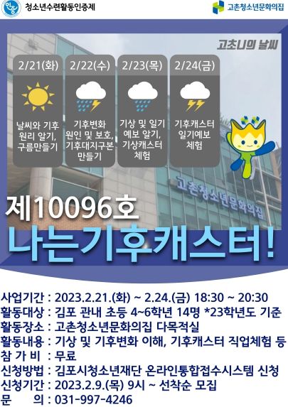 오는 2월 21일(화)부터 24일(금)까지 총 4일간(18시30분 ~ 20시30분) 고촌청소년문화의집에서 대면으로 운영되며, 기상 · 기후변화 이해 및 기상캐스터 진로체험활동 등으로 운영된다.