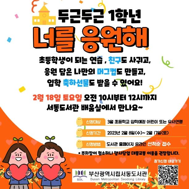 [제주교통복지신문 김강석 기자] 부산교육청 부산서동도서관은 2월 18일 오전 10시부터 12시까지 지역 내 초등학교 입학 예정 어린이 20명을 대상으로 ‘두근두근 1학년 너를 응원해’프로그램을 운영한다.