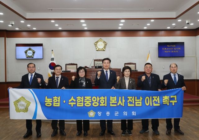 [제주교통복지신문 김강석 기자] 장흥군의회은 제279회 임시회에서‘농협·수협 중앙회 본사 전남 이전’을 촉구하는 건의안을 7명 의원 만장일치로 채택했다.