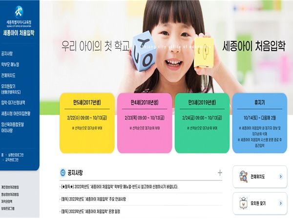 세종아이 처음입학은 세종시 생활권별로 구분해 유치원의 현황, 결원 정보 등을 제공하며, 유치원 결원 여부와 상관없이 세종시 내 모든 공‧사립유치원의 중간입학을 위한 대기신청이 가능한 시스템이다.