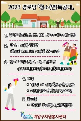 『경로당 청소(년)특공대』는 청소년 특공대를 구성하여, 경로당 내·외부 청소 와 어르신의 말벗 등을 지원하기 위한 사업이다.