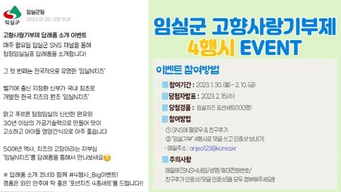 이번 이벤트는 임실군청 페이스북, 인스타, 카카오채널, 유튜브에 구독과 좋아요, 4행시 댓글 참여 인증샷을 담당자 이메일로 전송하면 참여 가능하다.