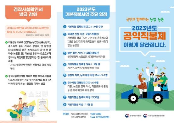 접수는 2월 한 달은 비대면으로, 3~4월에는 대면으로 나눠 진행한다. 비대면 접수는 기본 공익직불 등록정보의 변경이 없는 농업인이 대상이며, 대상자에게는 사전 신청 안내문이 문자로 전송되며 이를 통해 간편하게 온라인으로 신청하면 된다. 대면 접수는 신규신청자, 농법법인 등이 대상으로 면적이 가장 넓은 농지 소재지의 관할 읍·면사무소로 방문해 신청하면 된다.