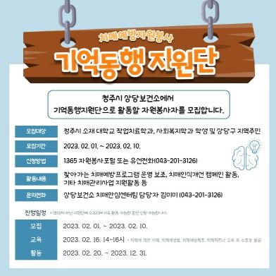 [제주교통복지신문 김강석 기자] 상당보건소는 오는 10일까지 치매예방을 위한 자원봉사자로 구성된‘기억동행지원단’20명을 모집한다고 9일 밝혔다.