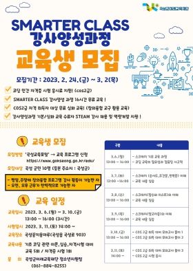 ‘SMARTER CLASS 강사양성과정’은 지역 내 교육 일자리 연계를 지원하고 교육 강사의 역량 강화를 도모하는 사업이다. 지역 내에서 창의융합 교육 및 미래산업 관련 프로그램 운영을 위한 전문 인력을 양성한다.