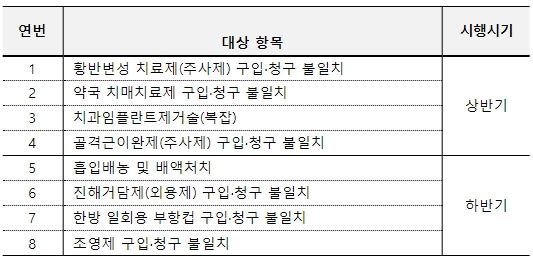 올해에 시행할 자율점검 대상 항목은 공정성․객관성․수용성을 제고하기 위하여 의약계가 참여한 ‘자율점검운영협의체’ 논의를 통해 ‘황반변성 치료제(주사제) 구입·청구 불일치’ 등 총 8개 항목을 선정했다.