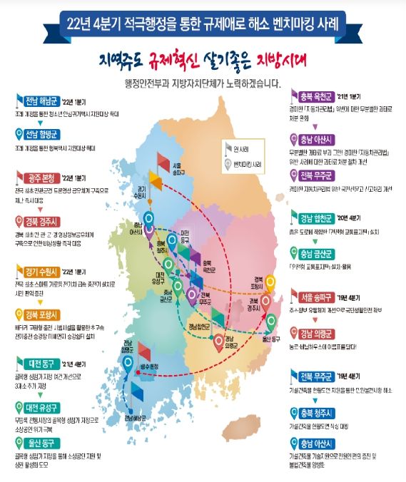[제주교통복지신문 김강석 기자] 행정안전부는 지자체가 적극행정을 통해 불합리한 규제를 개선하고, 주민의 삶의 질 향상에 기여한 ‘2022년 4분기 적극행정 규제혁신 우수사례’ 7건을 선정했다고 밝혔다.