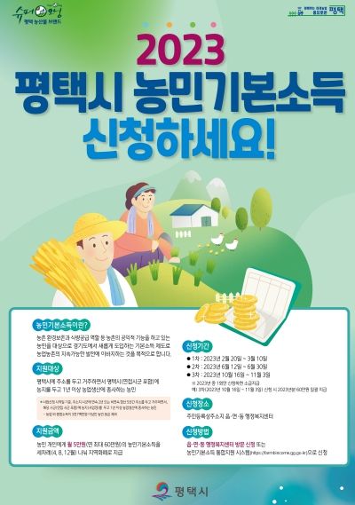 [제주교통복지신문 김강석 기자] 평택시가 오는 20일부터 3월 10일까지 농민기본소득 신청을 접수받는다고 밝혔다.