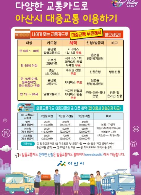 [제주교통복지신문 김강석 기자] 아산시가 시민들의 대중교통 이용 활성화를 위해 적극적인 개별 맞춤형 교통카드 혜택 안내에 나선다.