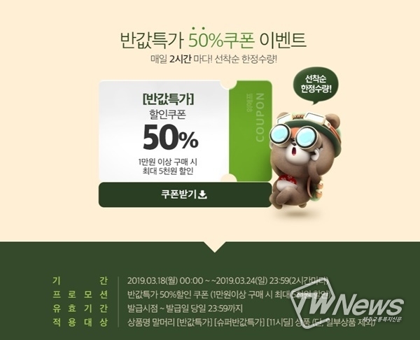 업체 측에 따르면 오는 24일까지 진행되는 위메프 반값특가는 매일 2시간마다 선착순에 의해 한정수량 만큼한 반값쿠폰을 지급한다는 계획이다.